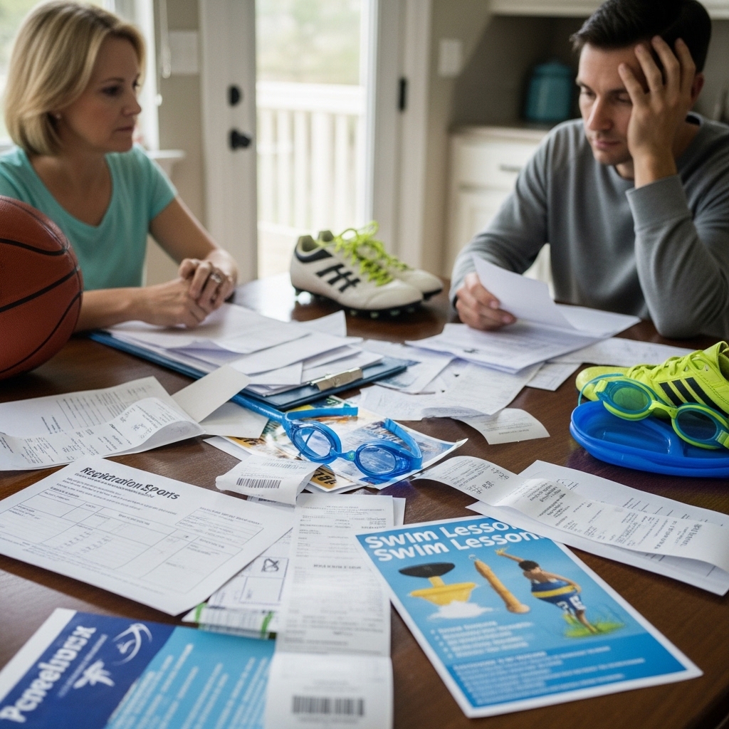 Two adult gym memberships at national averages run roughly $1,560 per year combined. One child in community-level youth soccer or basketball runs roughly $1,000 to $1,200, based on the Aspen data. A second child in private or club swim lessons can run $800 to $1,200 annually. Add equipment, uniforms, seasonal tournament fees, and modest travel, and another $400 to $1,000 appears on the running tab.